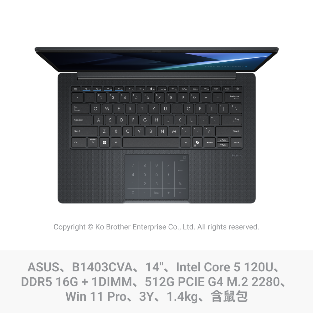 NB/ASUS/B1403CVA-1021A120U/14''/IPS/Intel Core 5 Processor 120U/DDR5 16G+1DIMM/512GB PCIe G4 M.2 2280/WIFI6E/WIN11 Pro/1.4KG/HDD不取回/3年國際保固+3年國內到府
